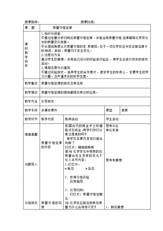 【内容简介】天津市宝坻区牛道口初级中学人教版九年级化学上册《5.1质量守恒定律》教案