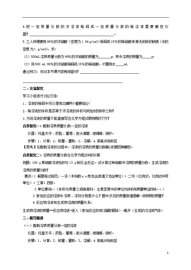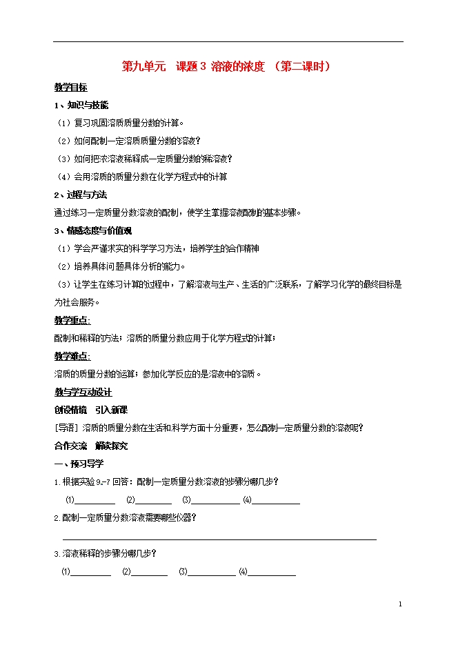 【内容简介】湖南省益阳市资阳区人教版九年级化学下册《第九单元课题3 溶液的浓度(第2课时)》教案