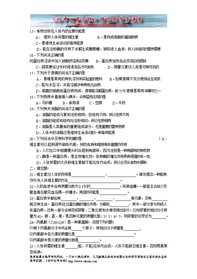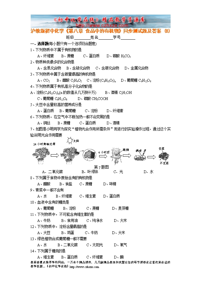 沪教版初中化学《第八章 食品中的有机物》同步测试题及答案 (B)