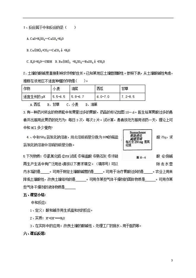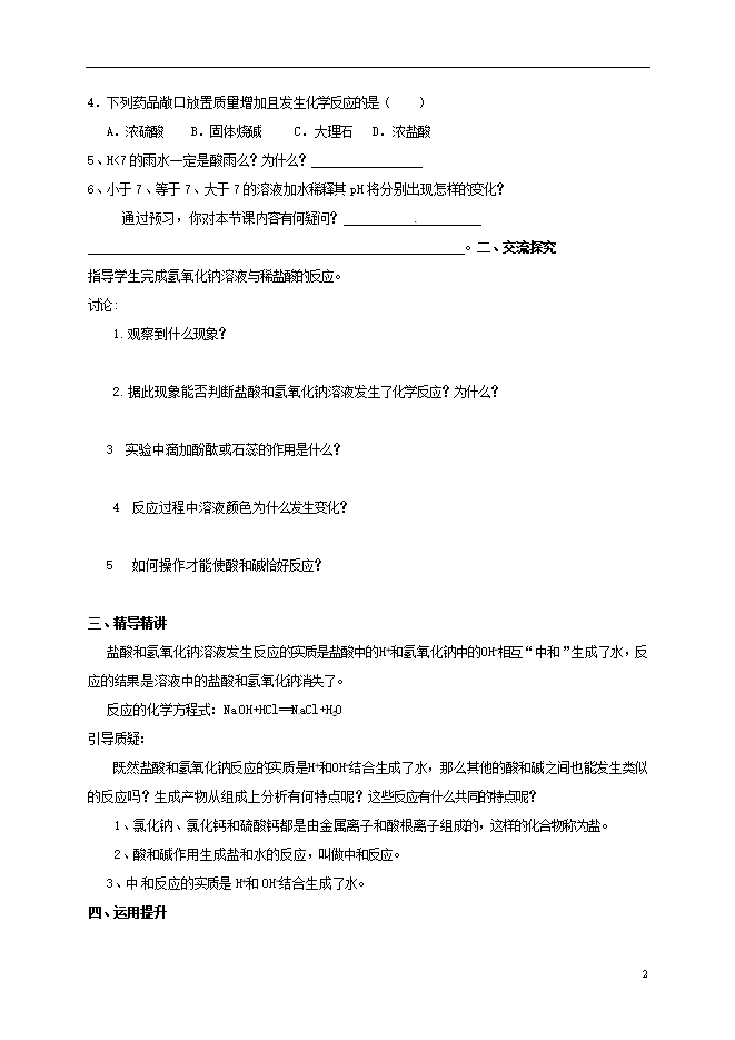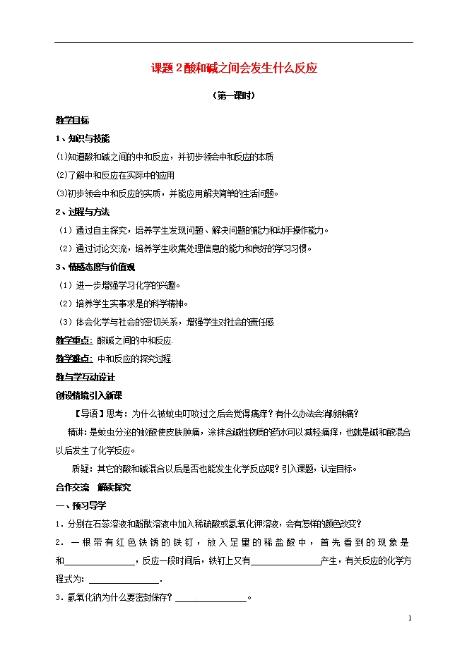 【内容简介】湖南省益阳市资阳区人教版九年级化学下册《第十单元课题2 酸和碱的中和反应(第1课时)》教案