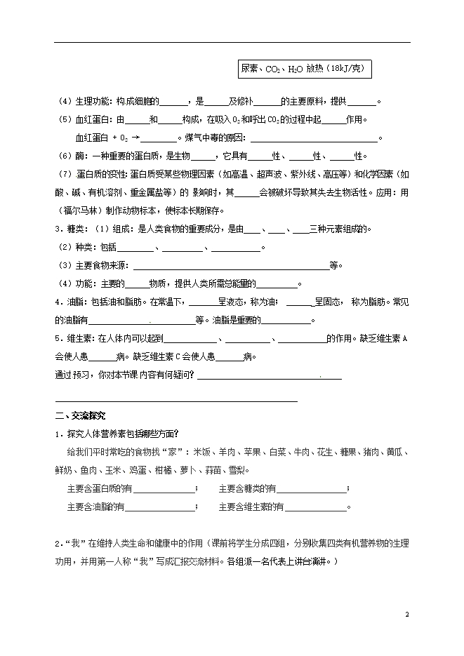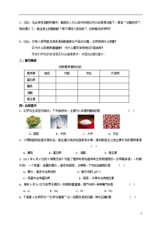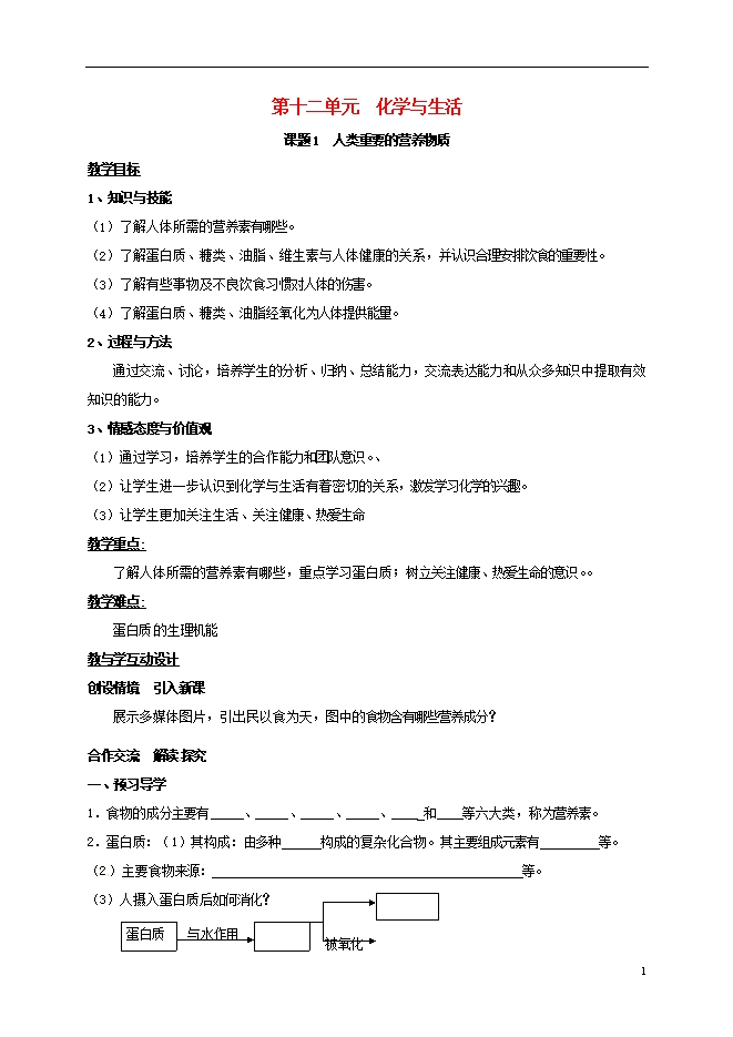 【内容简介】湖南省益阳市资阳区人教版九年级化学下册《第十二单元课题1 人类重要的营养物质》教案