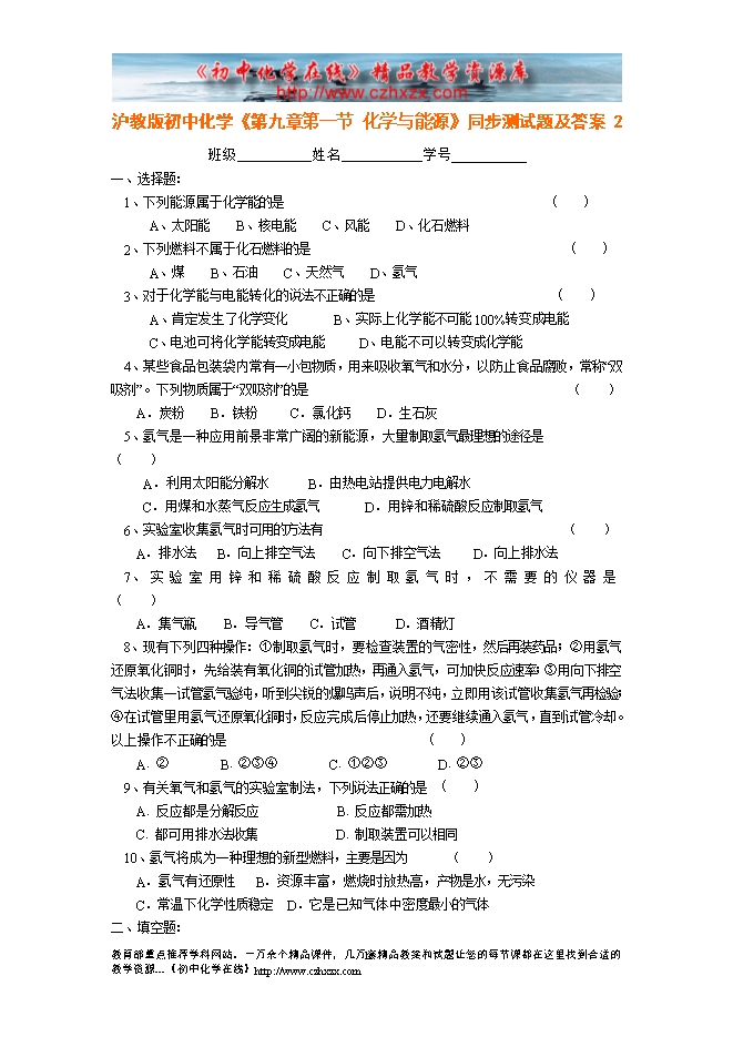 沪教版初中化学《第九章第一节 能源的综合利用》同步测试题及答案 2
