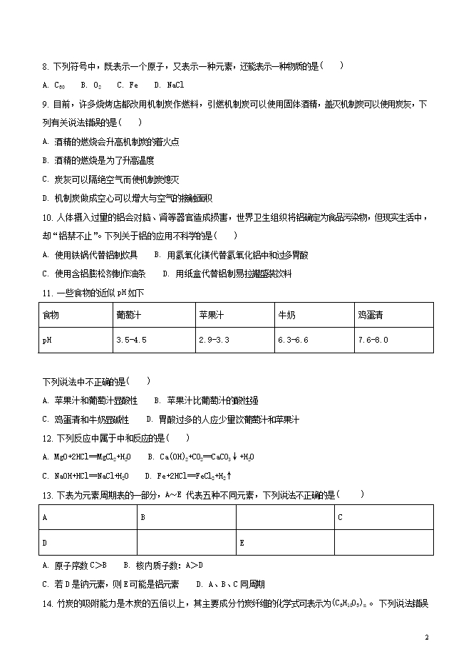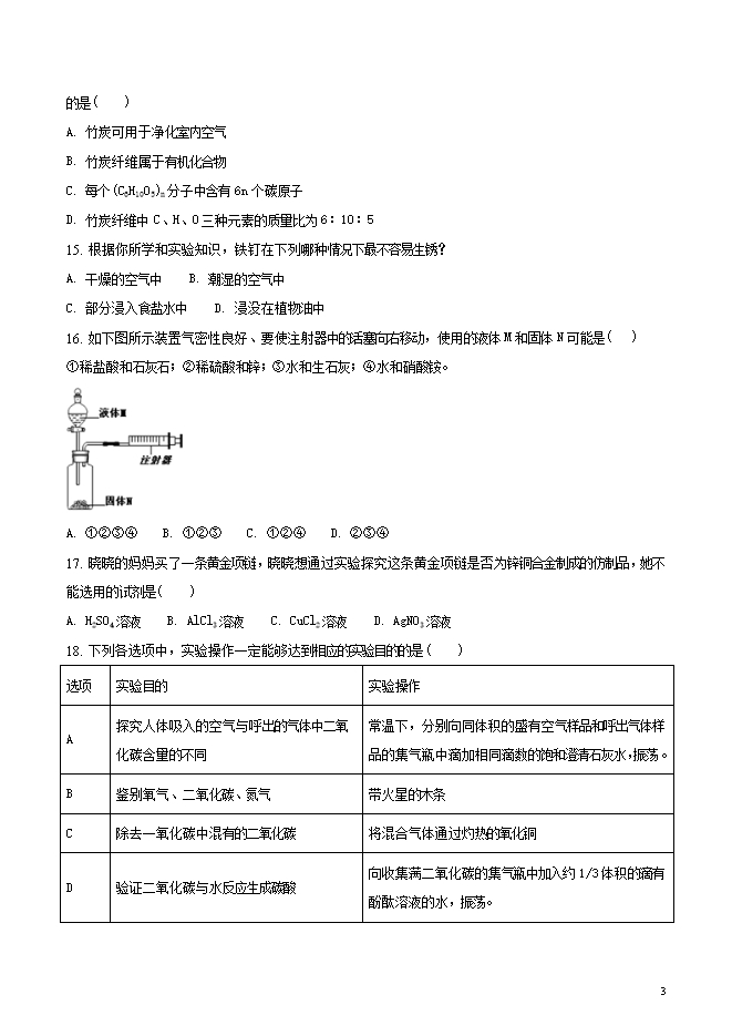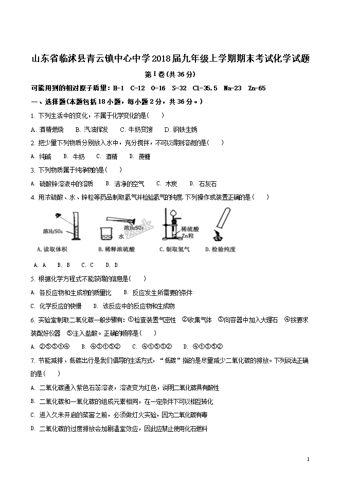 【内容简介】山东省临沭县青云镇中心中学2018届九年级上学期期末考试化学试题(word版无答案)