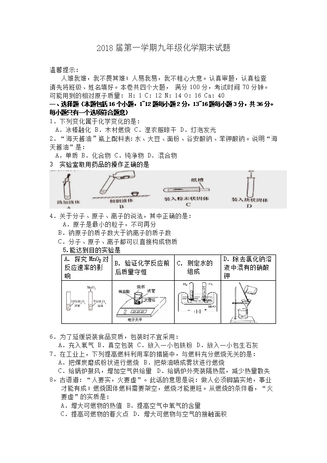 【内容简介】山东省商河县怀镇中学2018届第一学期九年级化学期末试题(word版含答案)