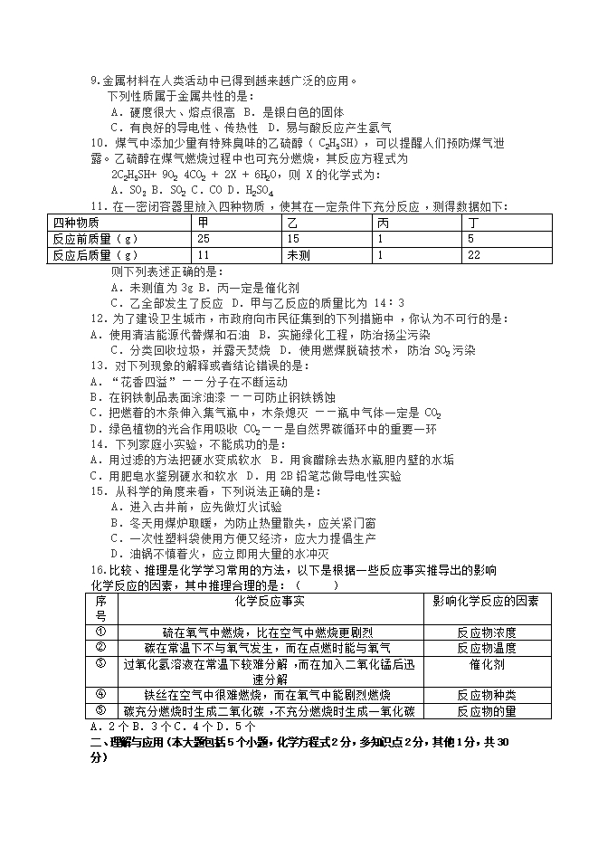 山东省商河县怀镇中学2018届第一学期九年级化学期末试题(word版含答案)
