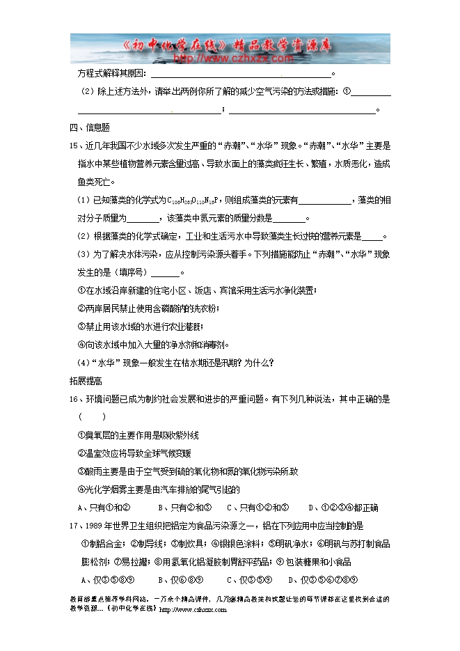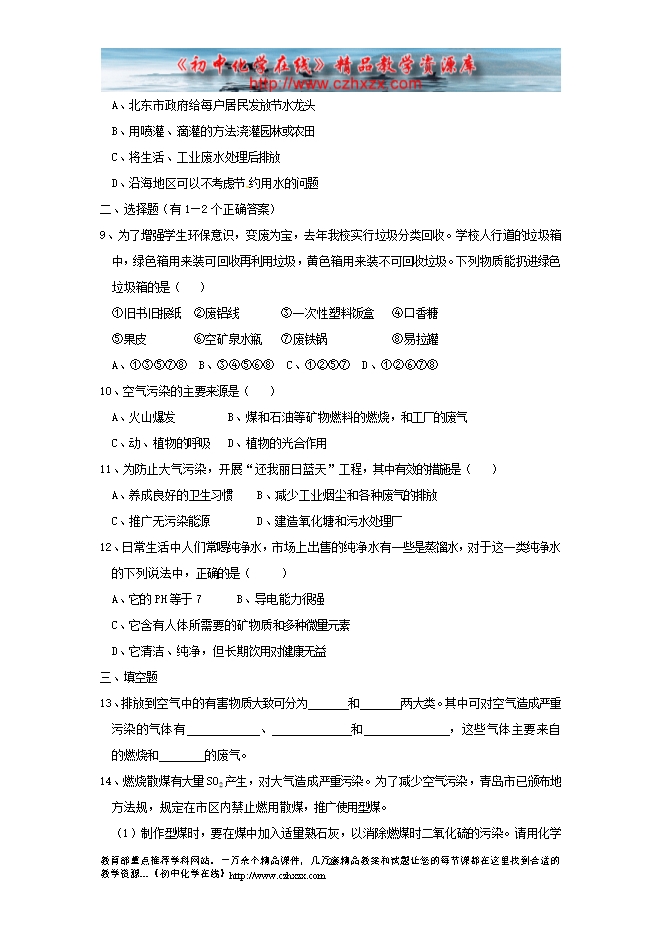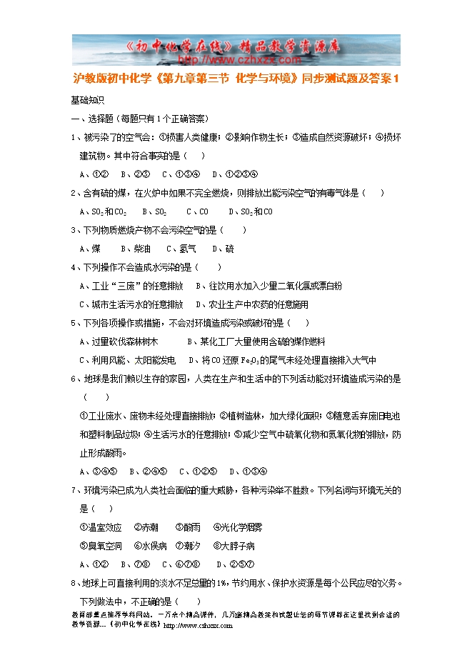 沪教版初中化学《第九章第三节 环境污染的防治》同步测试题及答案1