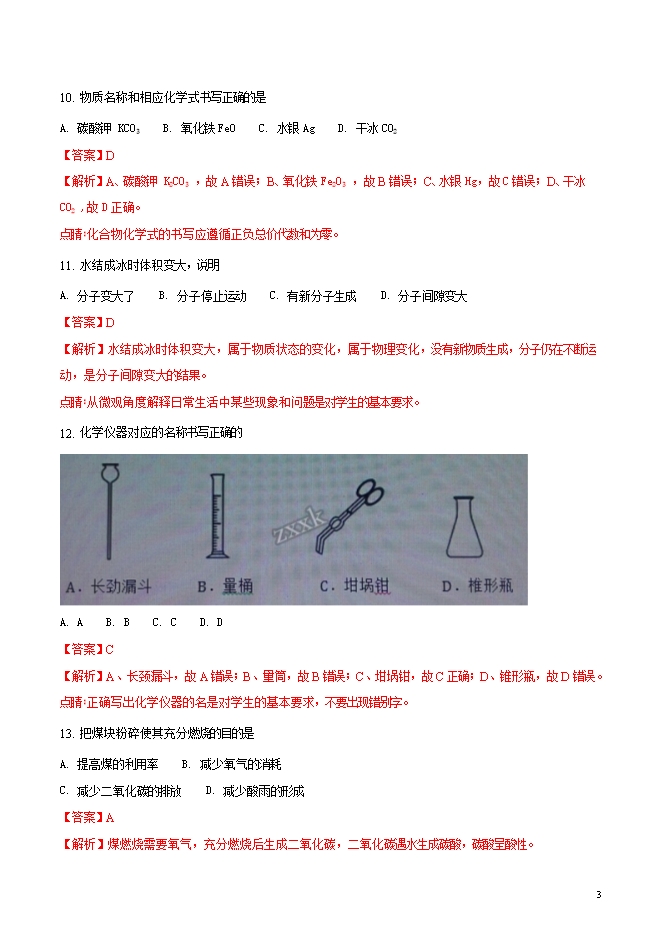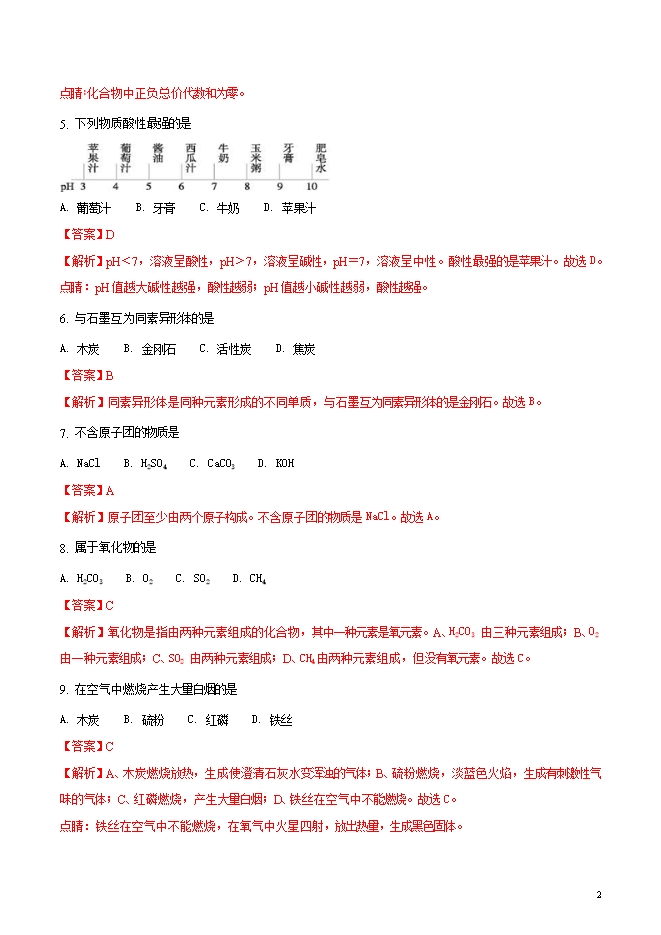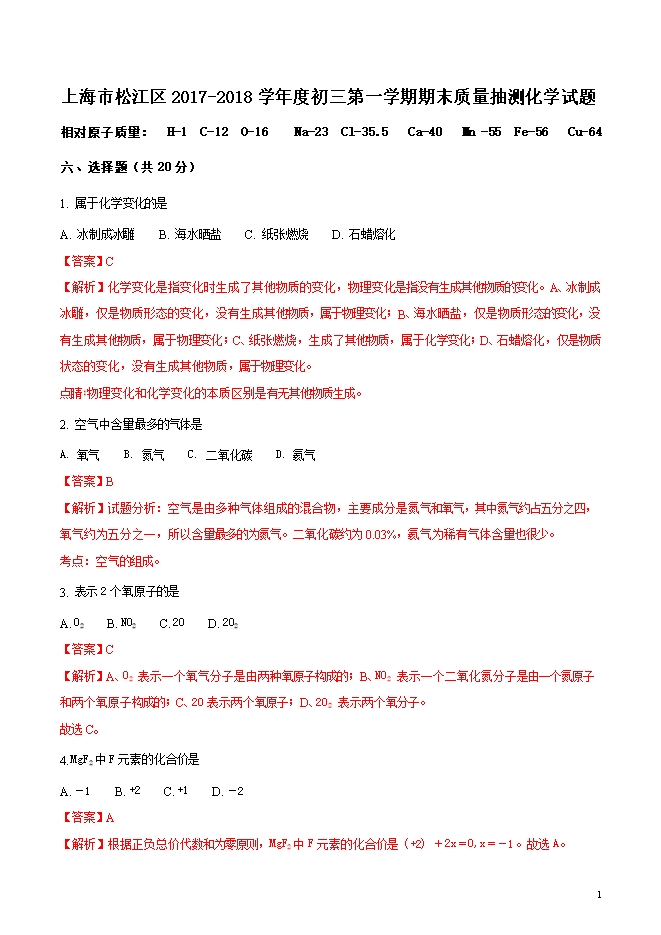 精品解析:上海市松江区2018届初三第一学期期末质量抽测化学试题(word版含答案解析)