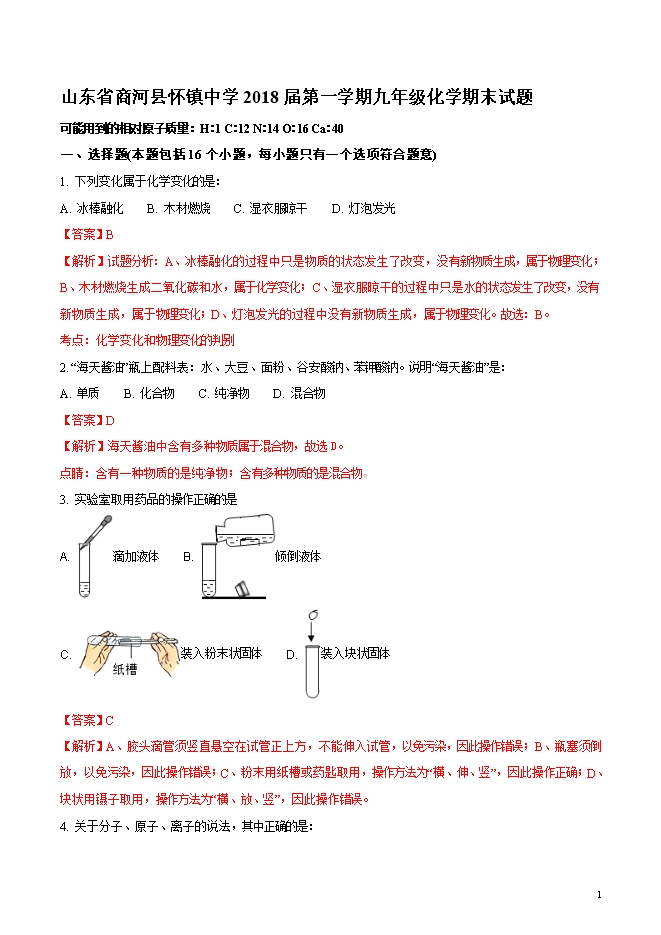 【内容简介】精品解析:山东省商河县怀镇中学2018届第一学期九年级化学期末试题(word版含答案解析)