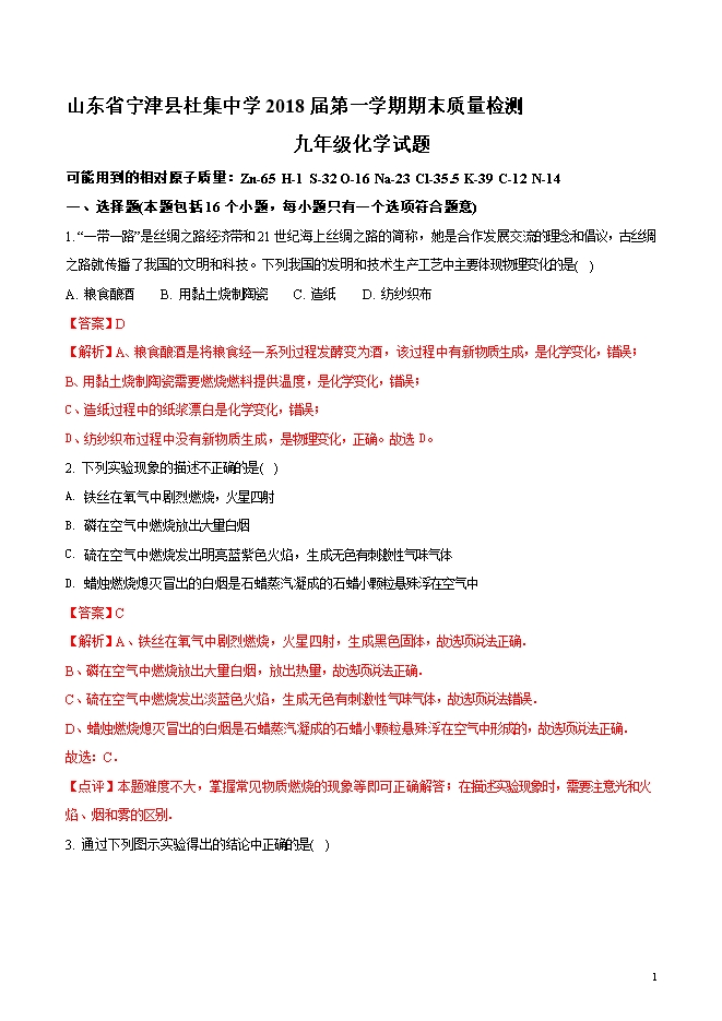 精品解析:山东省宁津县杜集中学2018届第一学期期末质量检测九年级化学试题(word版含答案解析)