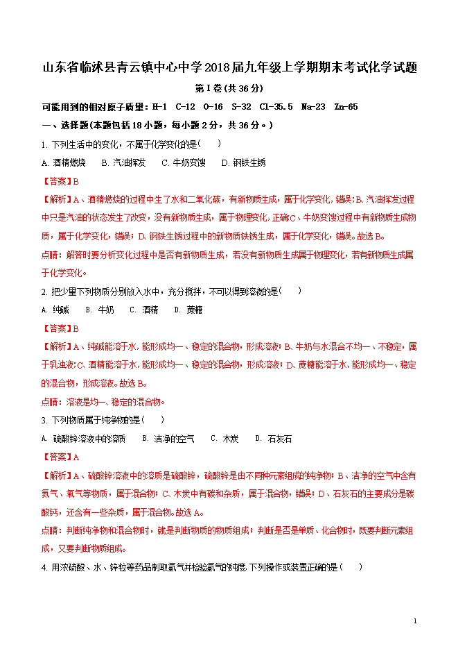 精品解析:山东省临沭县青云镇中心中学2018届九年级上学期期末考试化学试题(word版含答案解析)