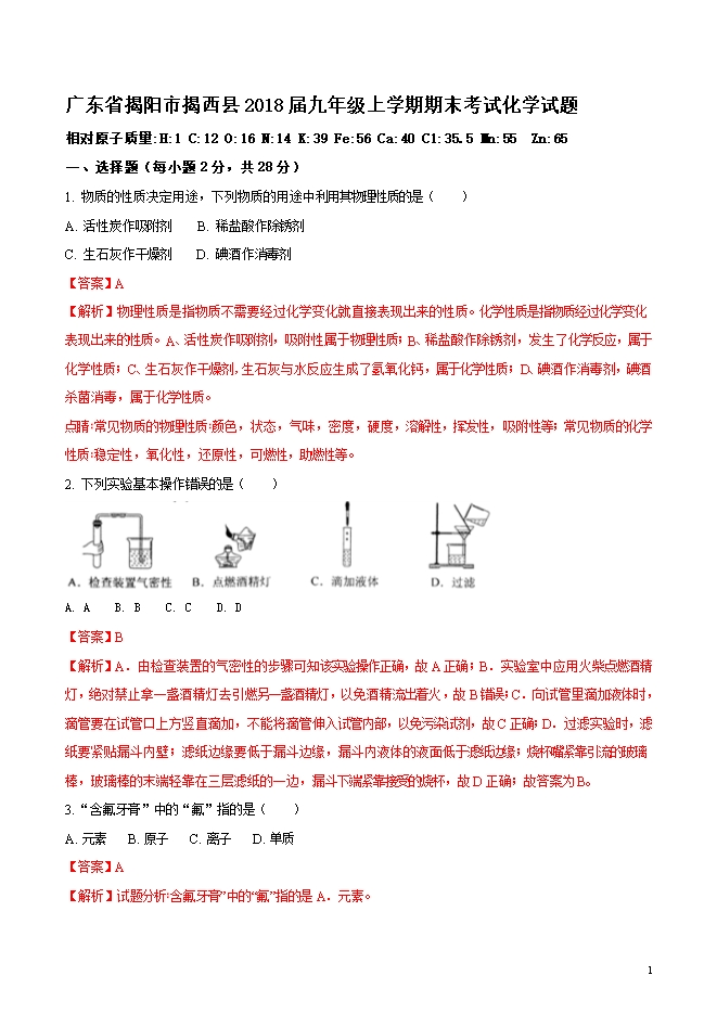 精品解析:广东省揭阳市揭西县2018届九年级上学期期末考试化学试题(word版含答案解析)