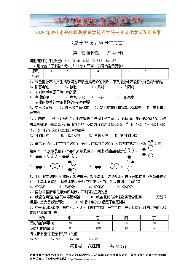 2009年达州市高中阶段教育学校招生统一考试化学试卷及答案