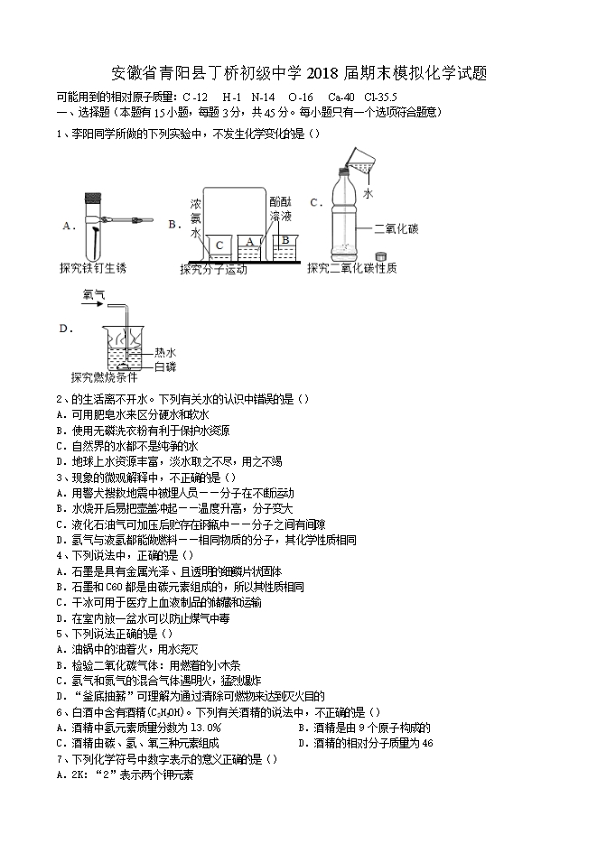 【内容简介】安徽省青阳县丁桥初级中学2018届第一学期期末模拟化学试题(word版无答案)
