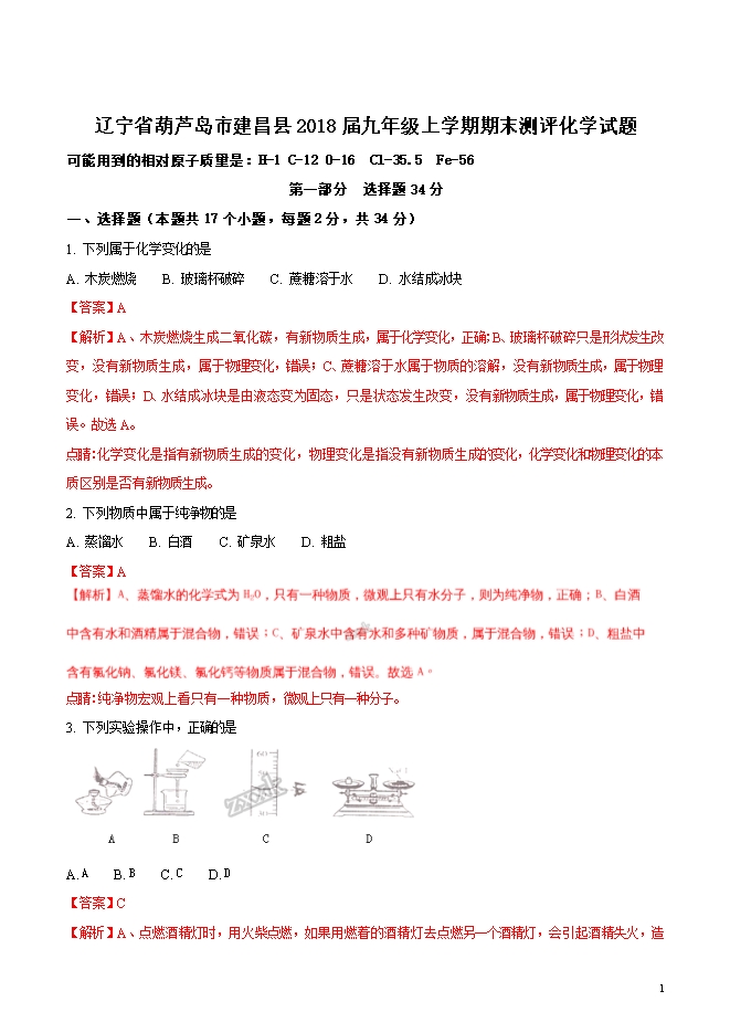 精品解析:辽宁省葫芦岛市建昌县2018届九年级上学期期末测评化学试题(word版含答案解析)