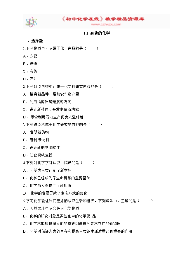 科粤版九年级化学上册《1.1身边的化学》预习检测(word版含解析)