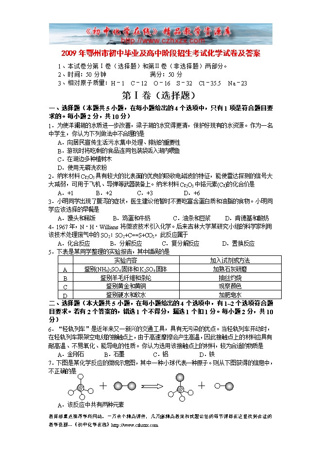 2009年鄂州市初中毕业及高中阶段招生考试化学试卷及答案