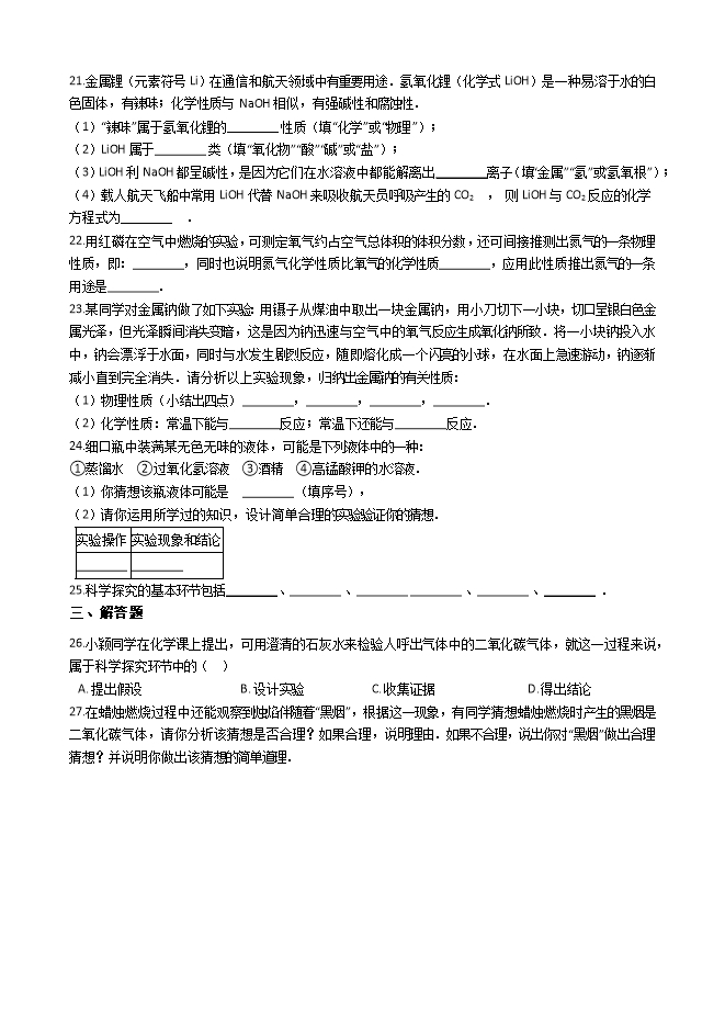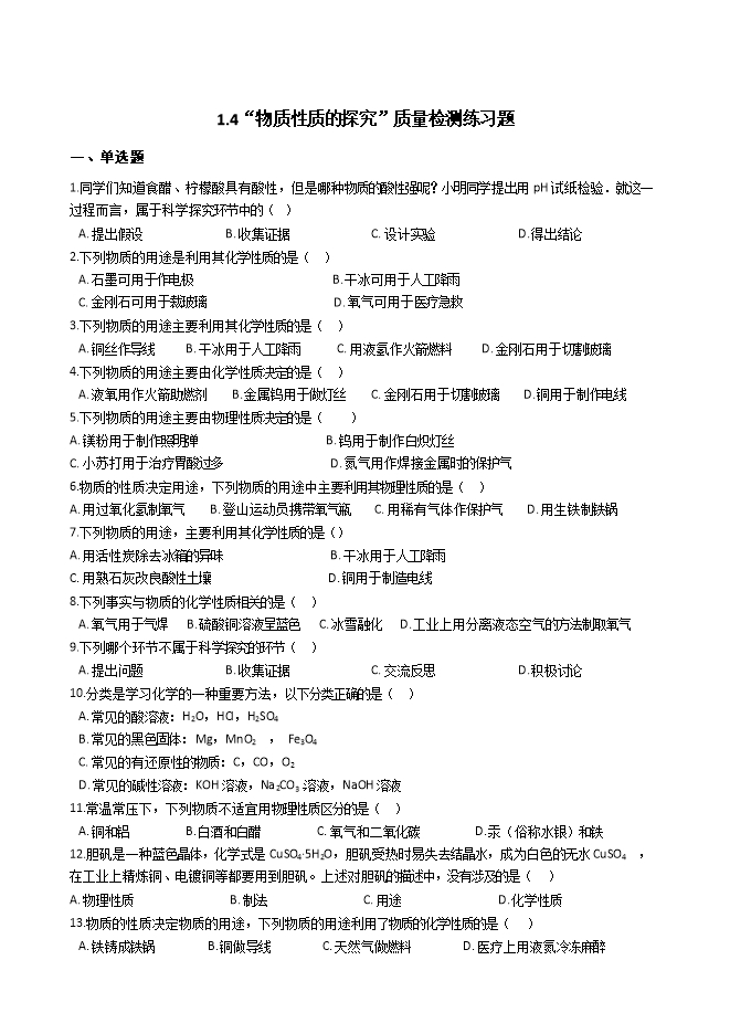 【内容简介】科粤版九年级化学上册《1.4物质性质的探究》同步练习(word版无答案)