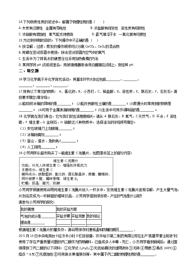 科粤版九年级化学上册《1.4物质性质的探究》同步练习(word版无答案)