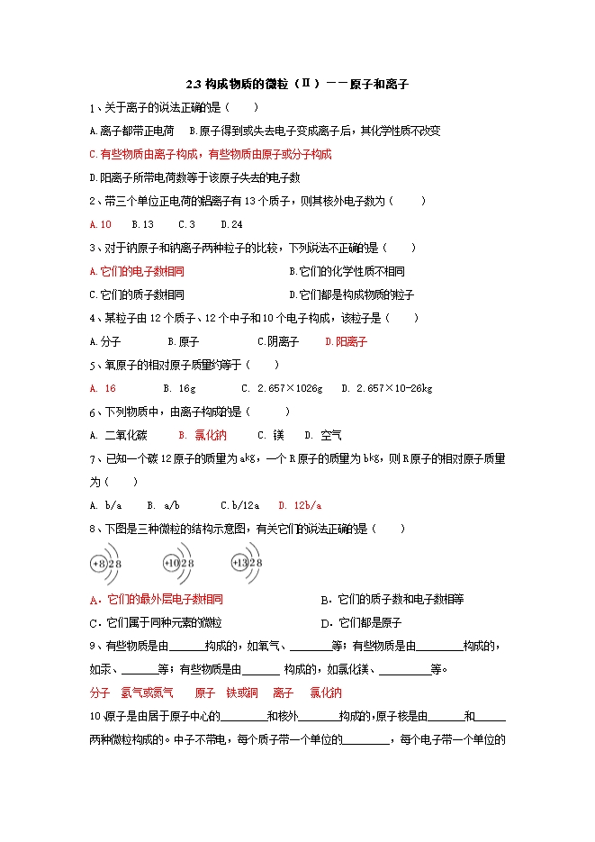 【内容简介】科粤版九年级化学上册《2.3构成物质的微粒(Ⅱ)—原子和离子》同步练习(word版含答案)