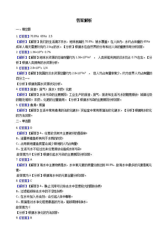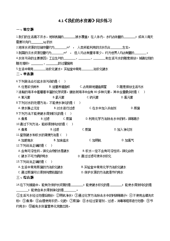 【内容简介】科粤版九年级化学上册《4.1我们的水资源》同步练习(word版含答案解析)