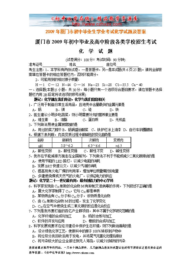 - 下一份试卷:2009年江苏省宿迁市初中毕业生学业考试化学试题及答案
