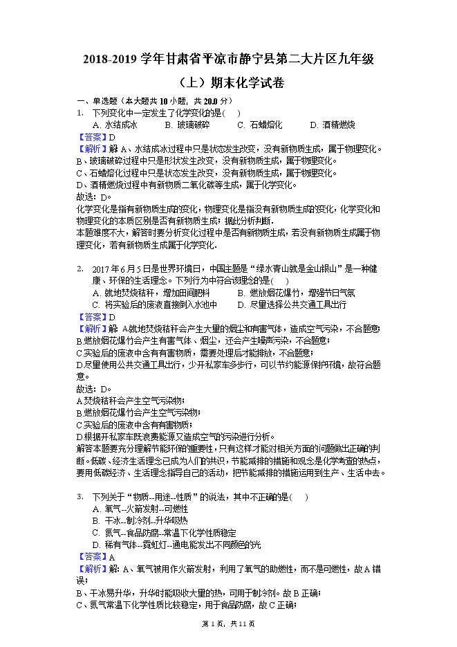 【内容简介】甘肃省平凉市静宁县第二大片区2018-2019学年九年级(上)期末化学试卷(word版含答案解析)