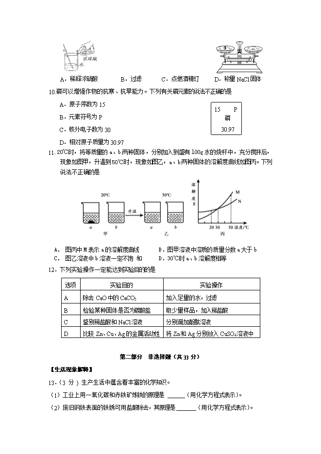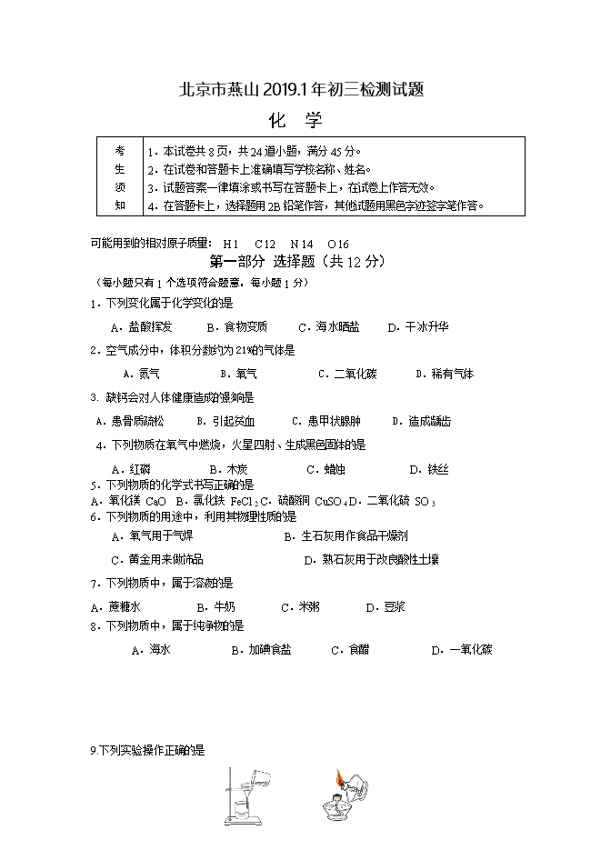 北京燕山区2018-2019学年度初三化学上学期期末试卷(word版含答案)