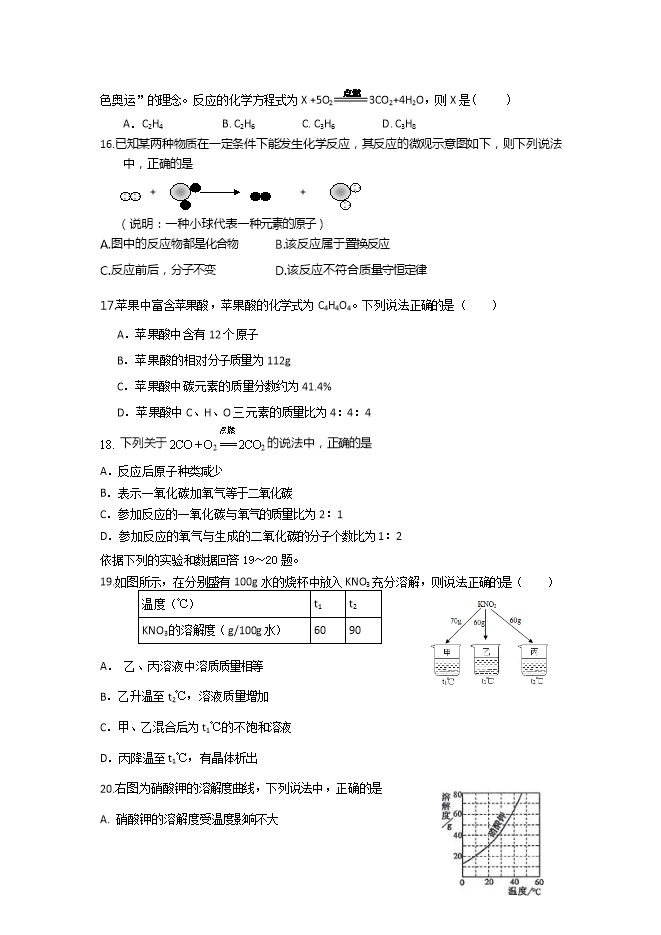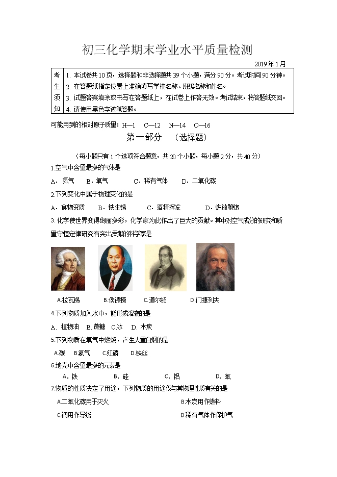 【内容简介】北京通州区2018-2019学年度初三化学上学期期末试卷(word版含答案)