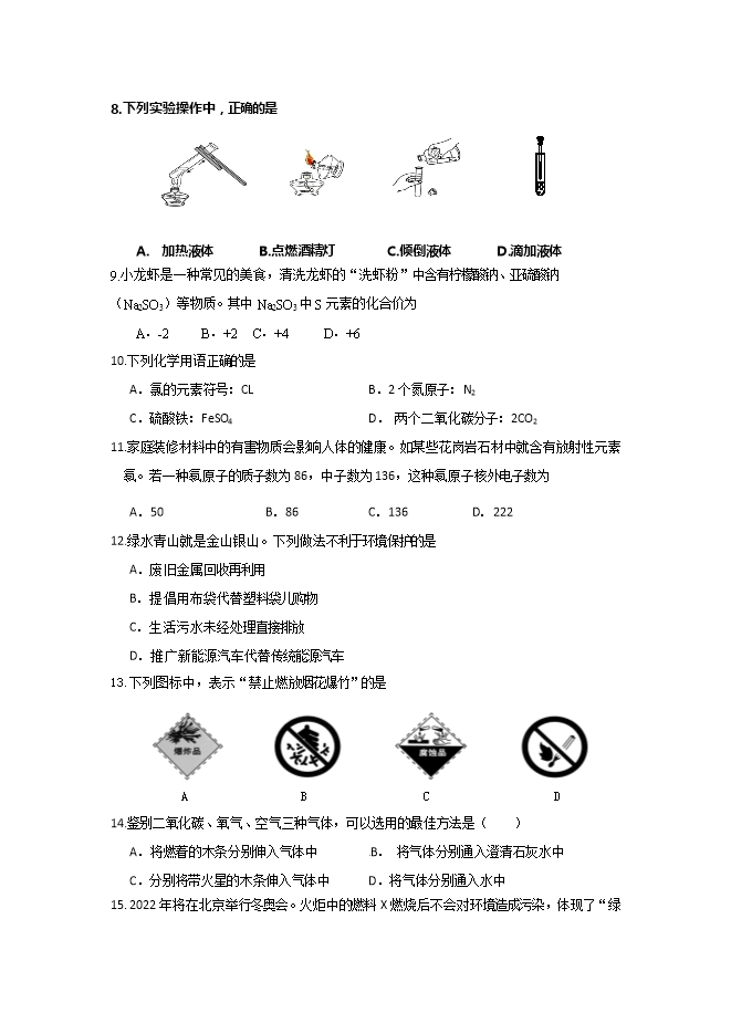 北京通州区2018-2019学年度初三化学上学期期末试卷(word版含答案)