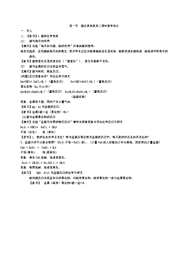 【内容简介】鲁教版九年级化学下册《7.1 酸及其性质(第二课时)》教学设计