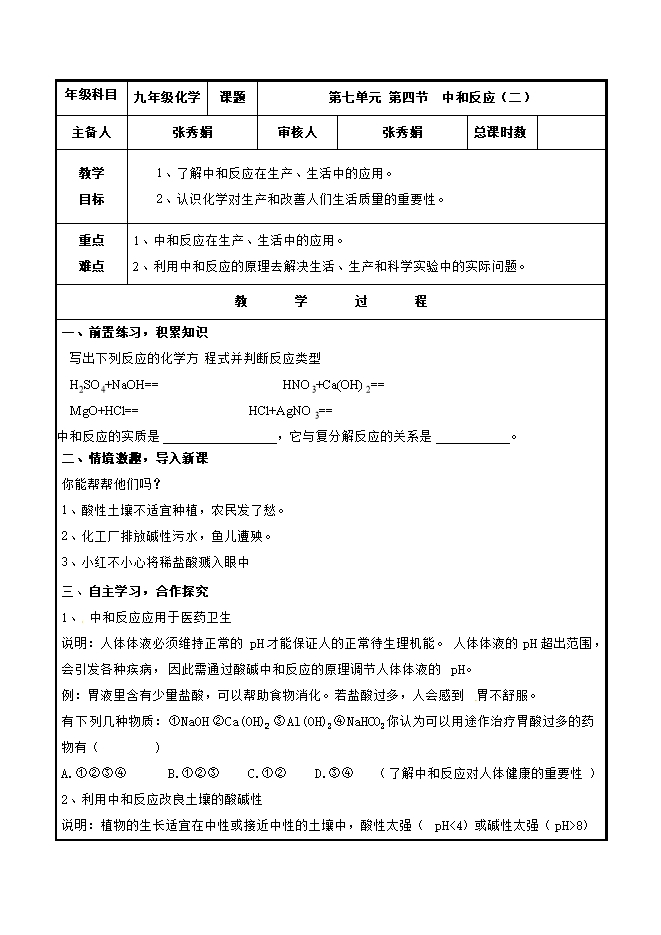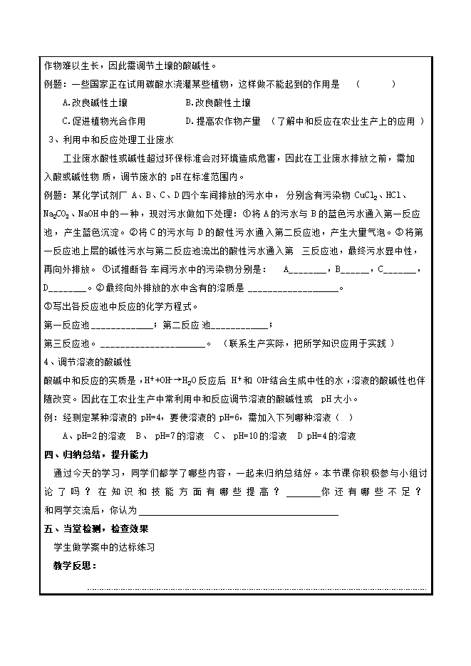 【内容简介】鲁教版九年级化学下册《7.4酸碱中和反应(第二课时)》教学设计