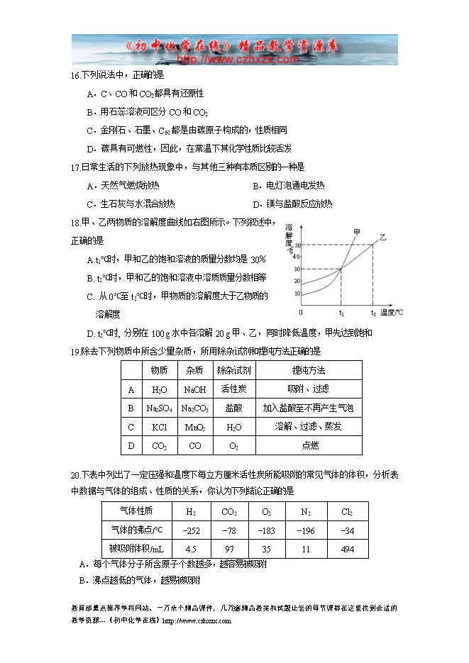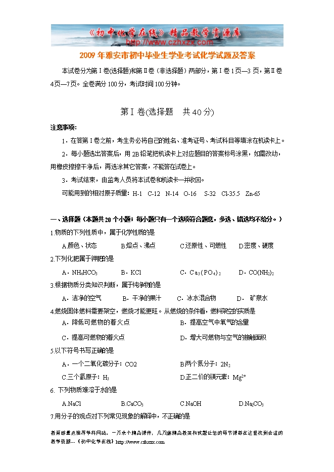 2009年雅安市初中毕业生学业考试化学试题及答案