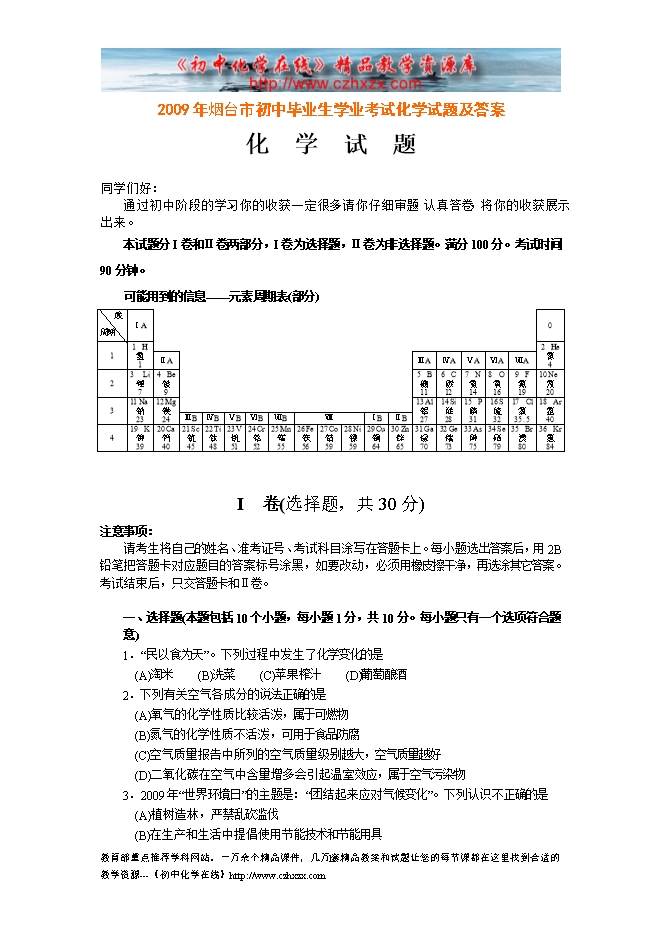 2009年烟台市初中毕业生学业考试化学试题及答案