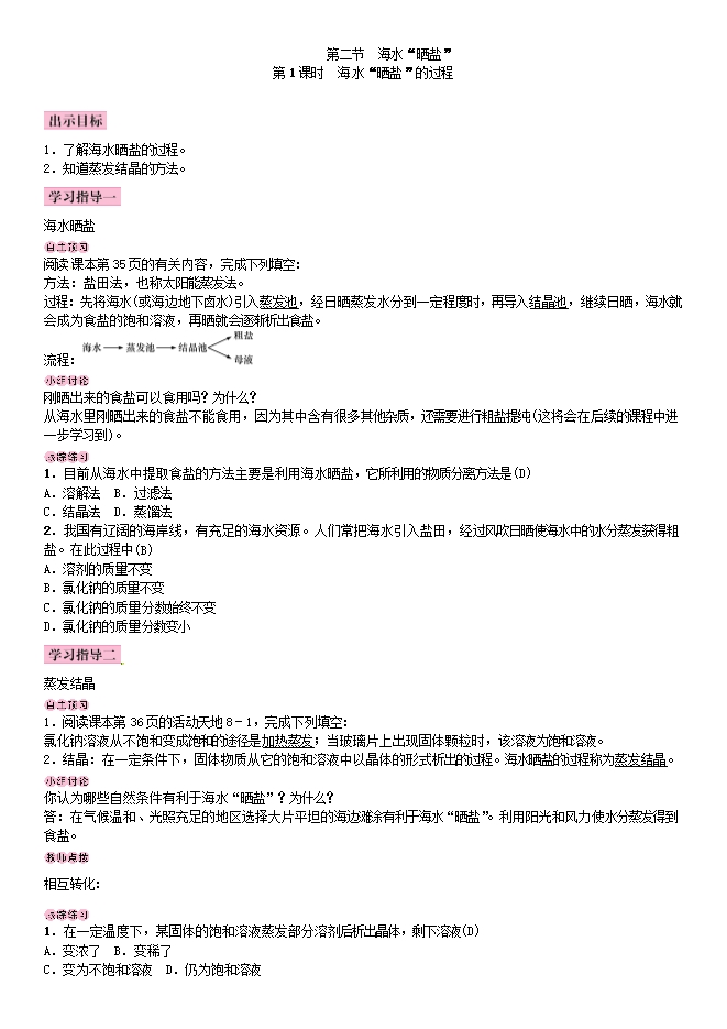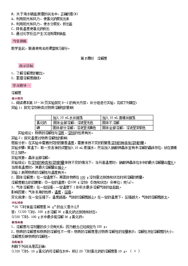 【内容简介】鲁教版九年级化学下册《8.2海水“晒盐”》教学设计