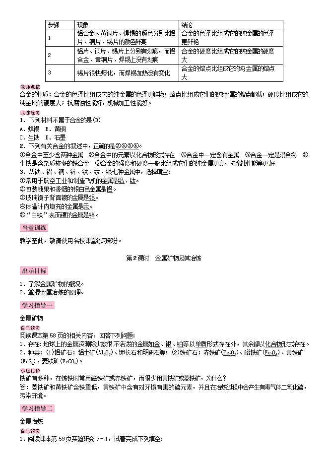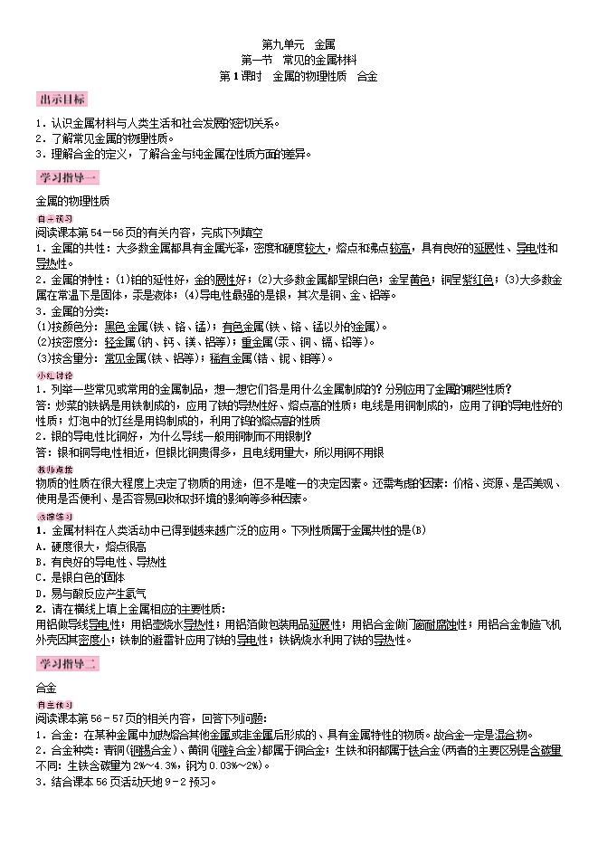 【内容简介】鲁教版九年级化学下册《9.1常见的金属材料》教学设计