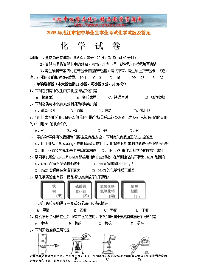 2009年湛江市初中毕业生学业考试化学试题及答案