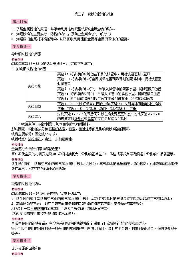 【内容简介】鲁教版九年级化学下册《9.3钢铁的锈蚀与防护》教学设计
