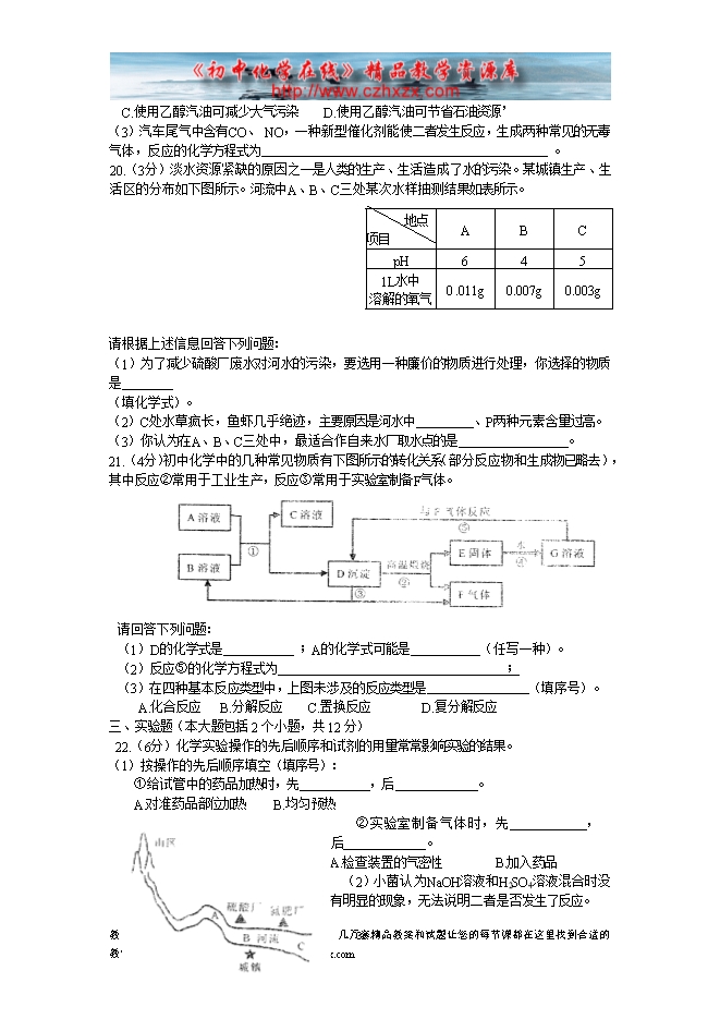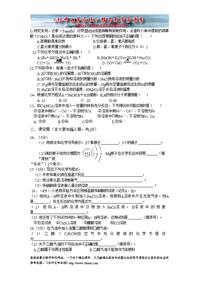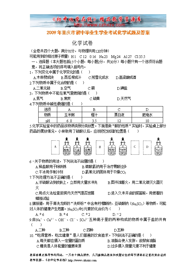 2009年重庆市初中毕业生学业考试化学试题及答案