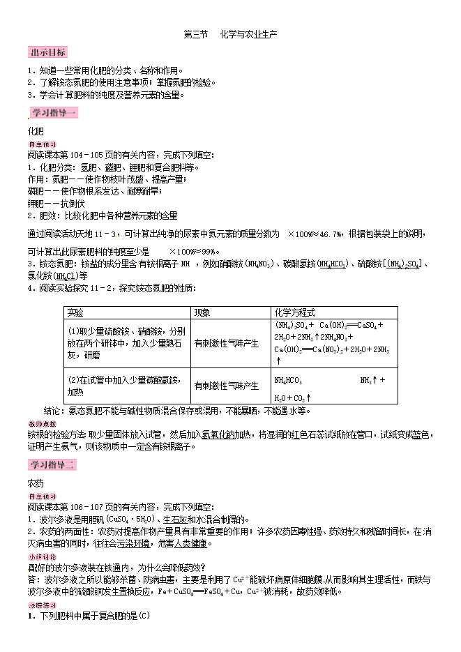 【内容简介】鲁教版九年级化学下册《11.3化学与农业生产》教学设计