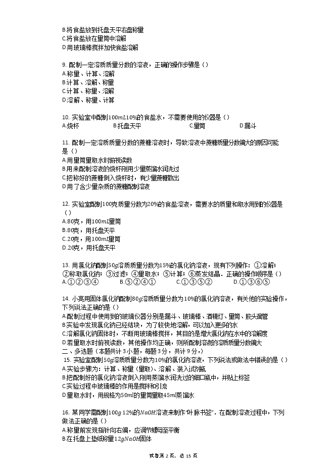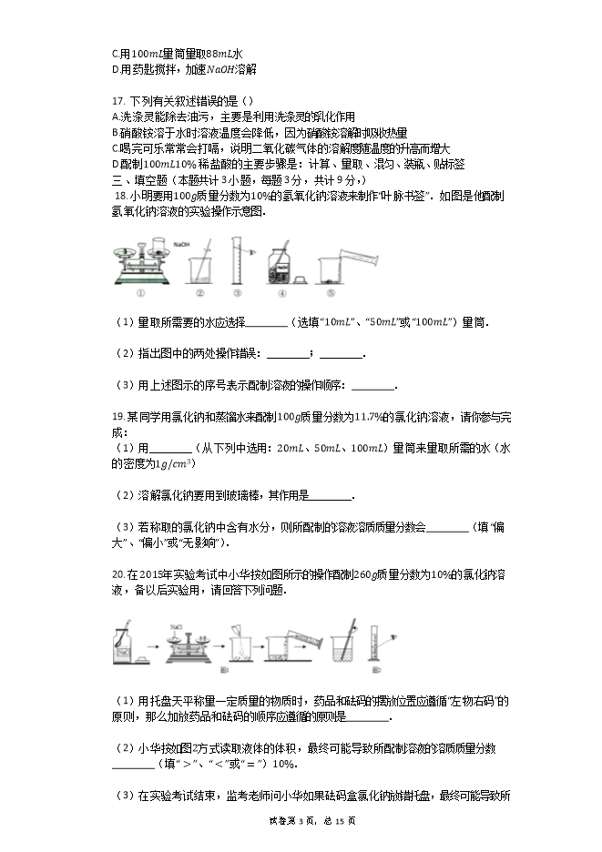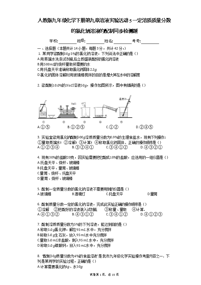 【内容简介】人教版九年级化学下册《9.4实验活动一定溶质质量分数的氯化钠溶液的配制》同步检测题(word版含答案解析)