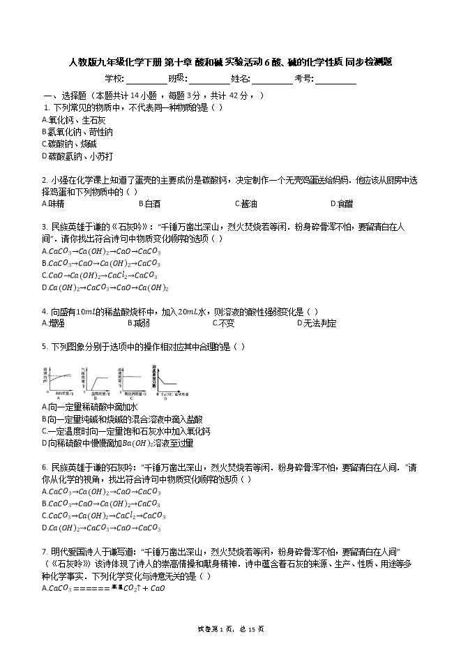 【内容简介】人教版九年级化学下册《10.3实验活动6_酸、碱的化学性质》同步检测题(word版含答案解析)