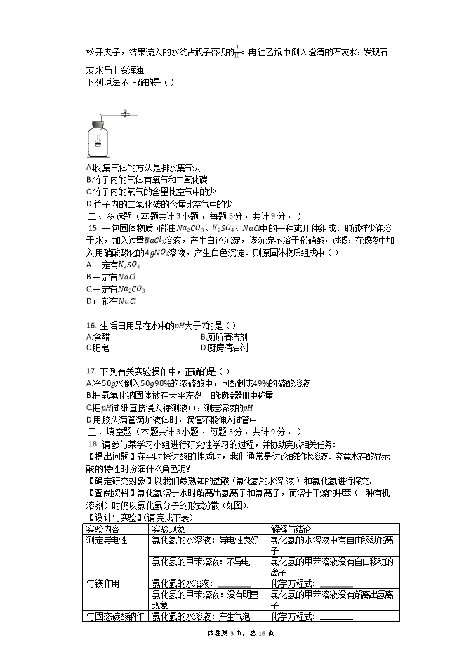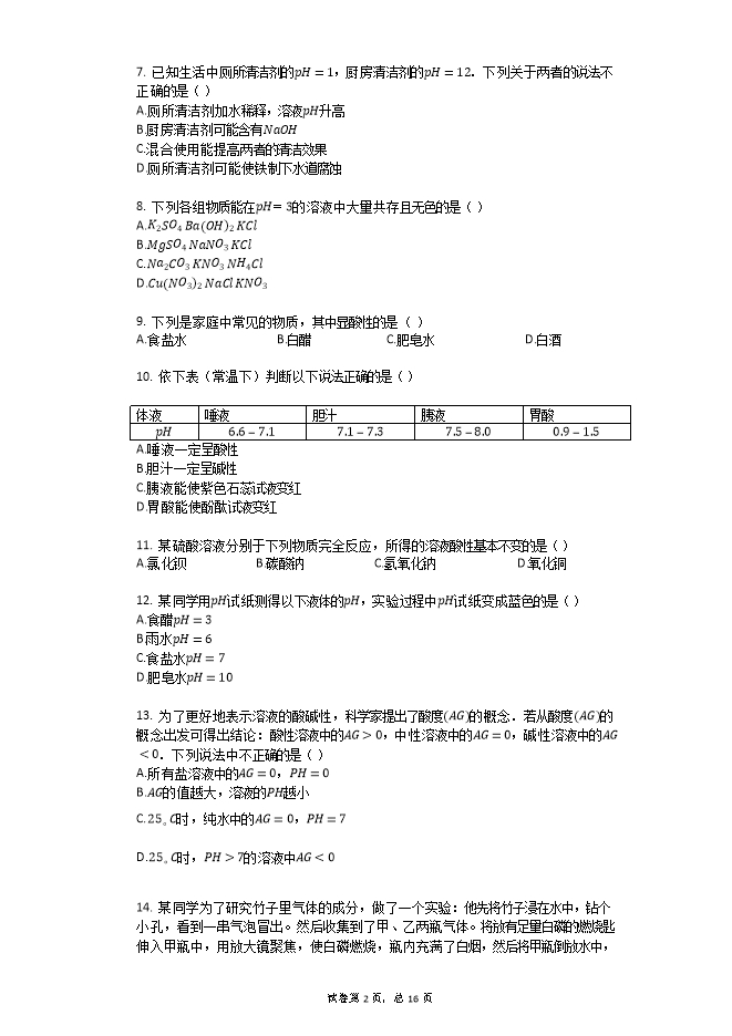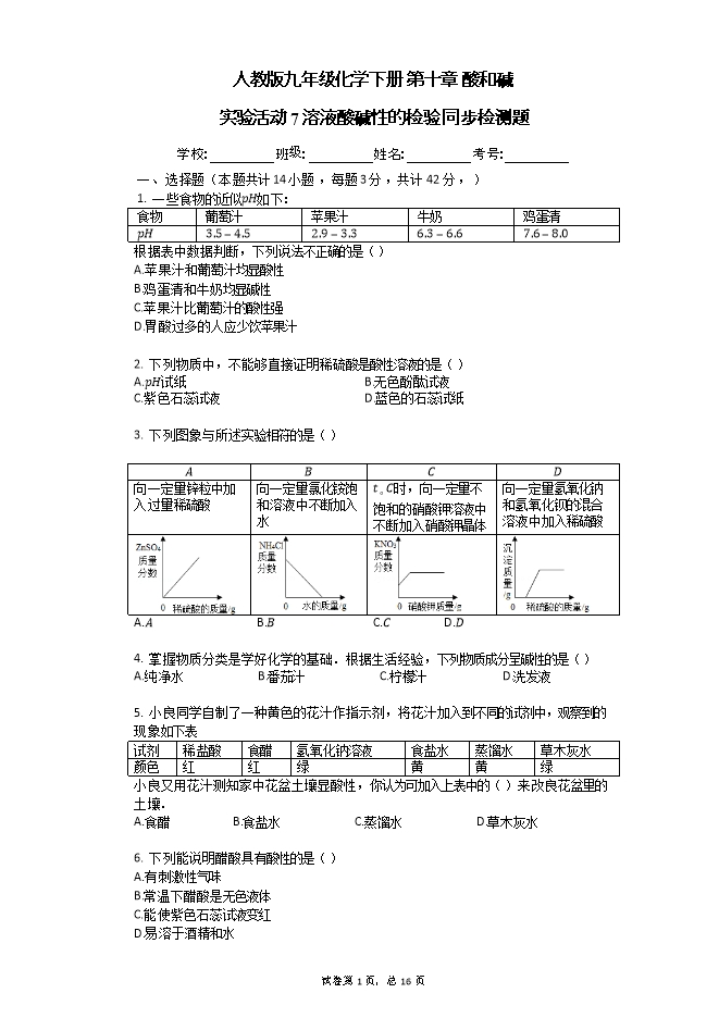 【内容简介】人教版九年级化学下册《10.4实验活动7_溶液酸碱性的检验》同步检测题(word版含答案解析)