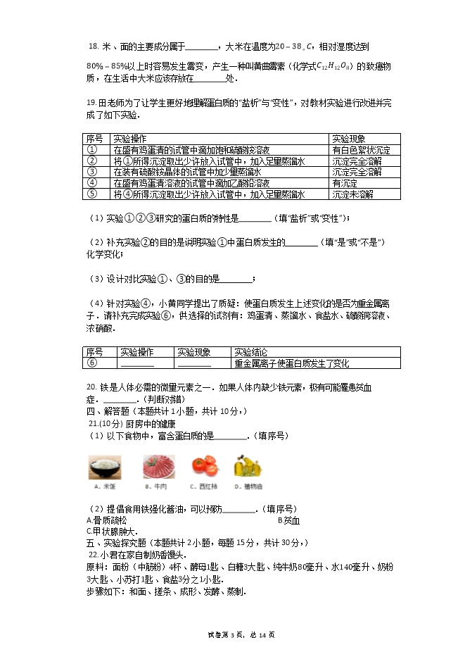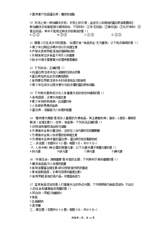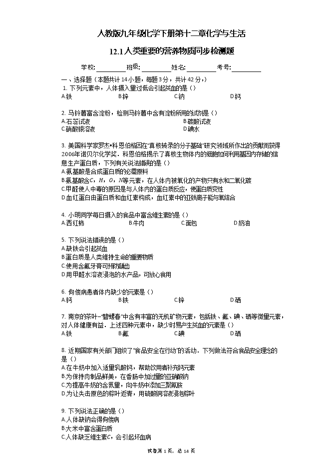 【内容简介】人教版九年级化学下册《12.1_人类重要的营养物质》同步检测题(word版含答案解析)