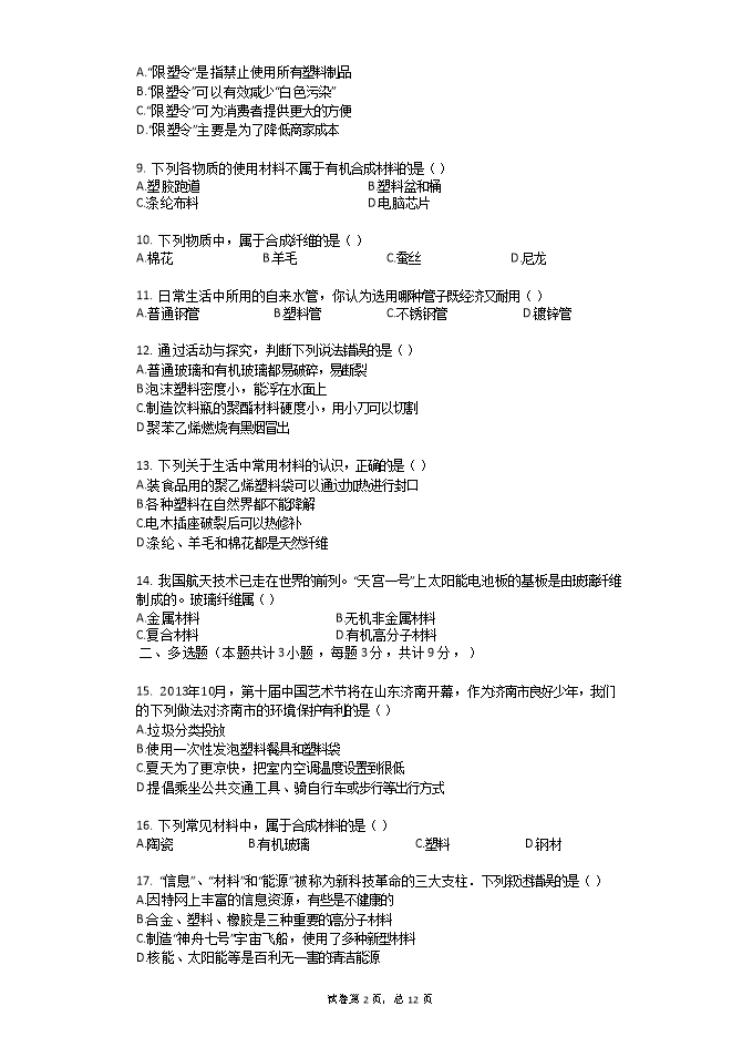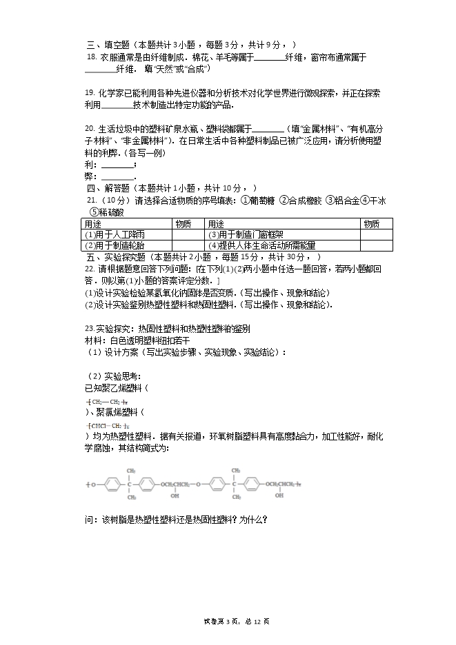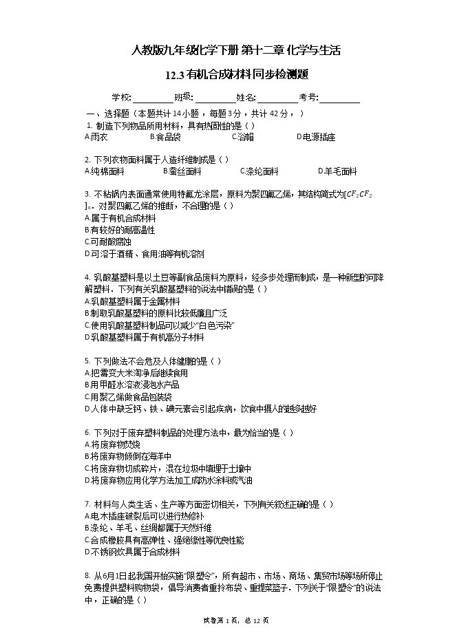【内容简介】人教版九年级化学下册《12.3_有机合成材料》同步检测题(word版含答案解析)