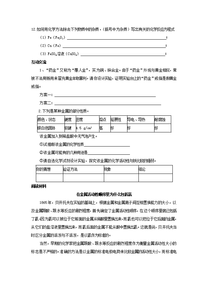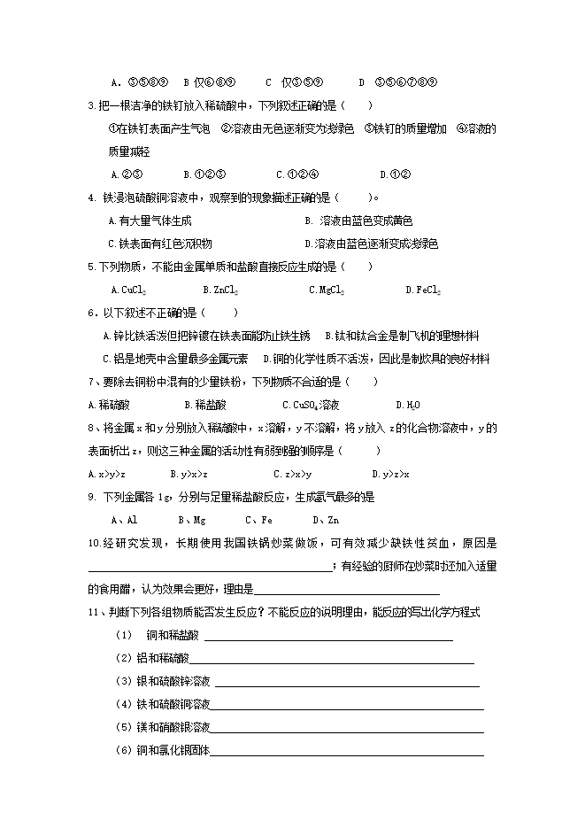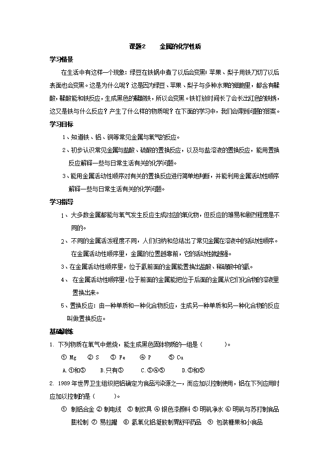 【内容简介】人教版九年级化学下册《8.2金属的化学性质》导学案 (word版无答案)