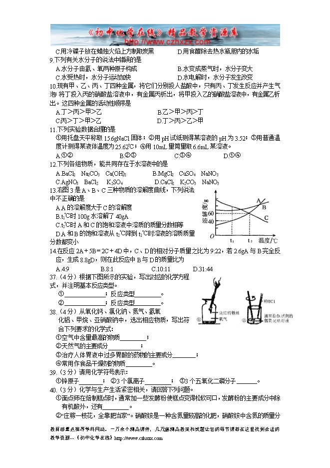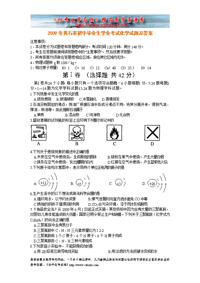 2009年黄石市初中毕业生学业考试化学试题及答案