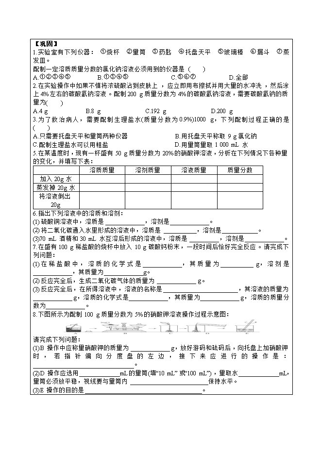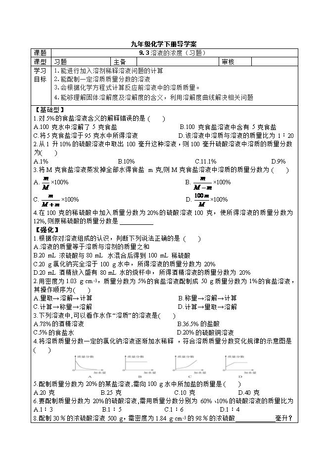 【内容简介】人教版九年级化学下册《9.3溶液的浓度(第二课时)》导学案 (word版无答案)
