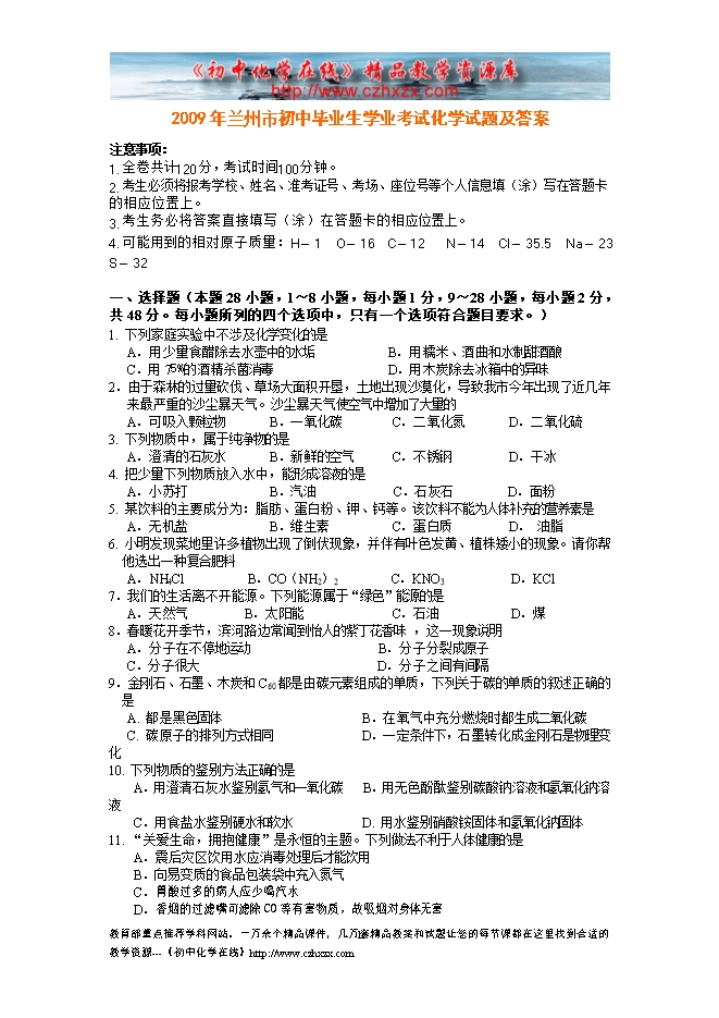 2009年兰州市初中毕业生学业考试化学试题及答案