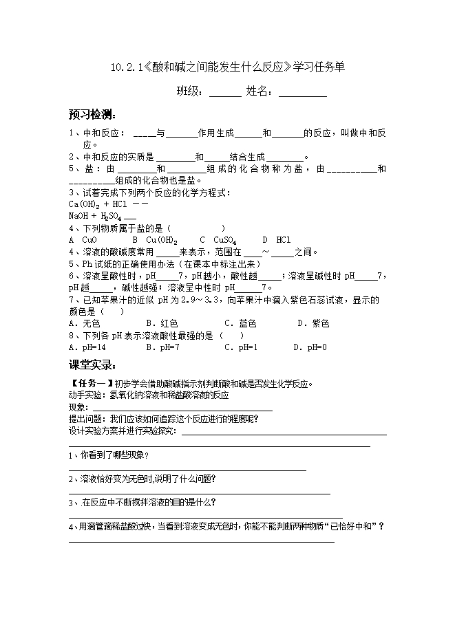 【内容简介】人教版九年级化学下册《10.2酸和碱的中和反应》导学案 (word版无答案)
