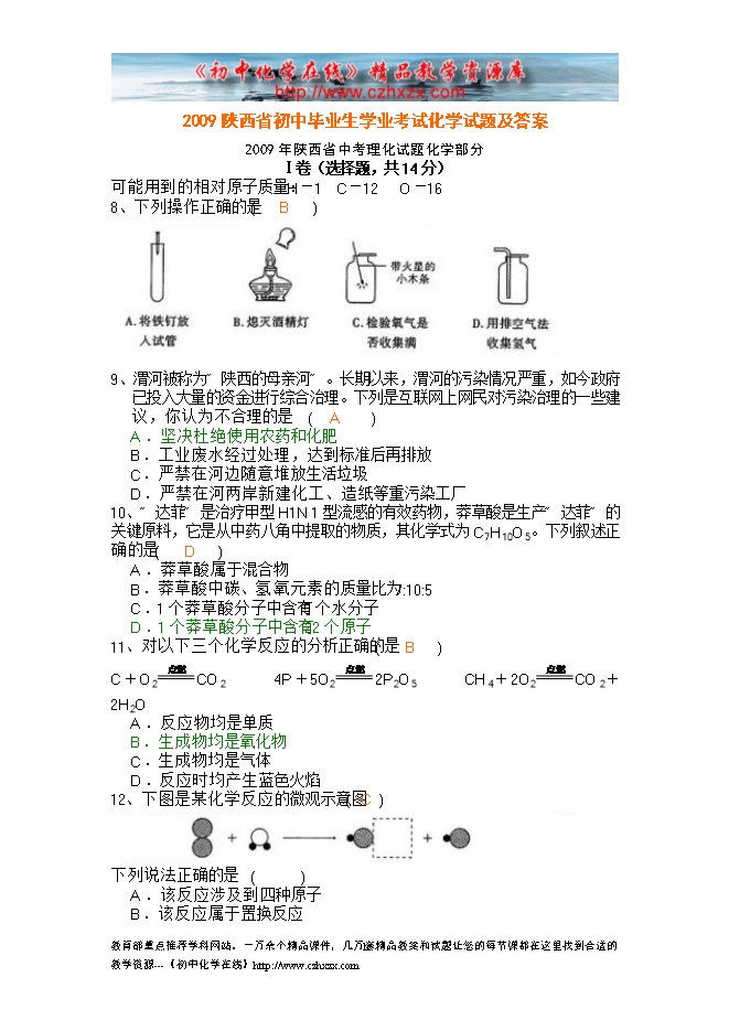 2009年陕西省初中毕业生学业考试化学试题及答案